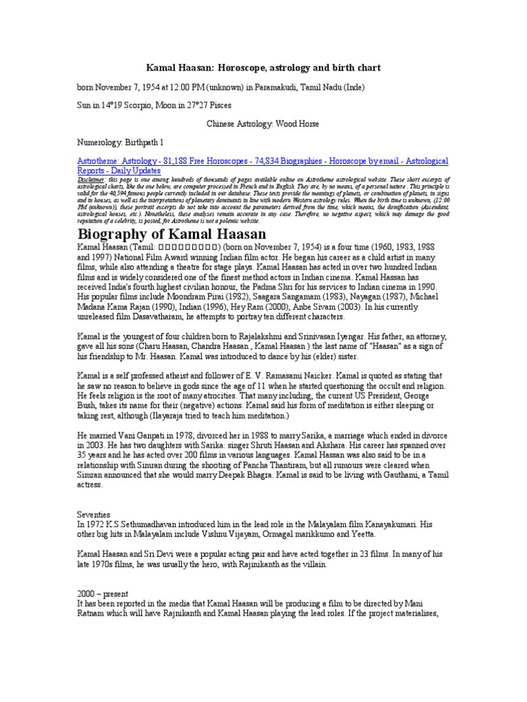 Kamal Haasan Astrology : Know kamal haasan's age, family background, political life, educational qualification, biography, achievements, assets, caste, contact number, address, speech, latest news. Kamal Haasan Astrology - Know what developments will unfold in haasan's future life as per the astrology analysis.